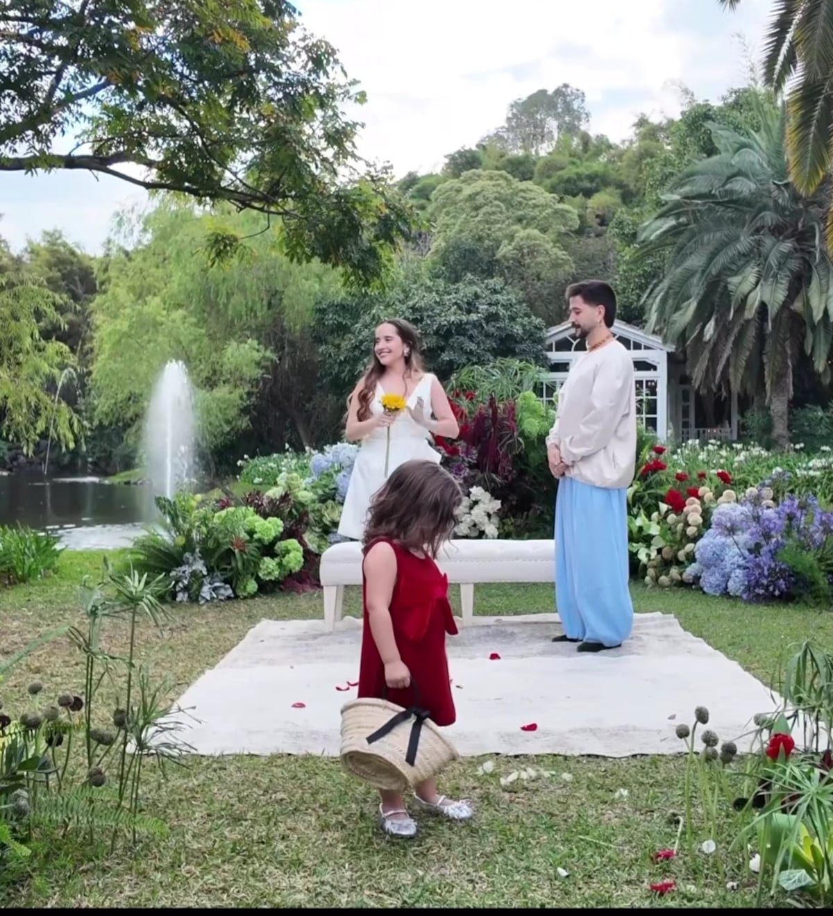Camilo y Evaluna en el altar, mientras su hija Índigo arrojaba flores a su alrededor. Foto: Capturada del video de @camilo.