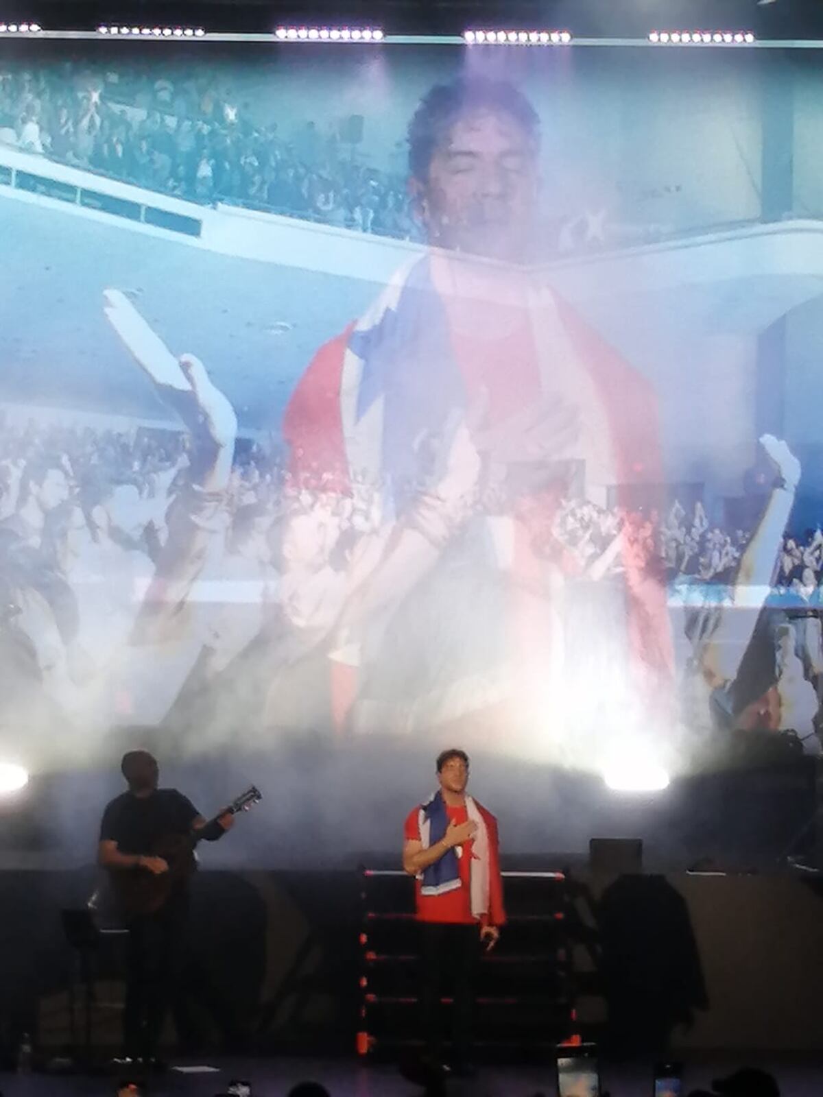 Cerrando el concierto con el suéter de la selección de futbol y la bandera de Panamá.