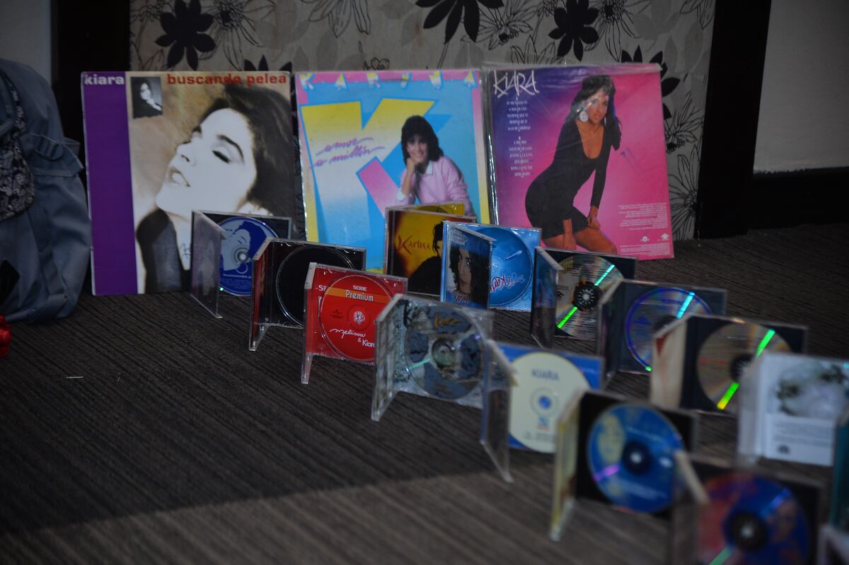 Un asistente a la conferencia de prensa llevó CD y long play (al fondo) de Karina y Kiara.