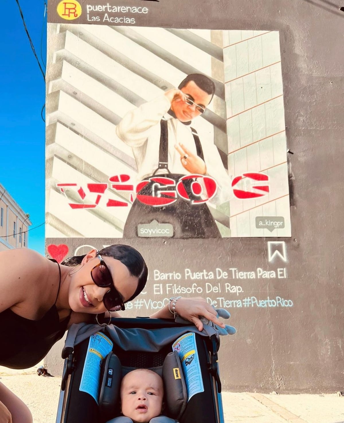 Marangely y su bebé junto a un mural de Vico c pintado en San Juan, Puerto Rico.