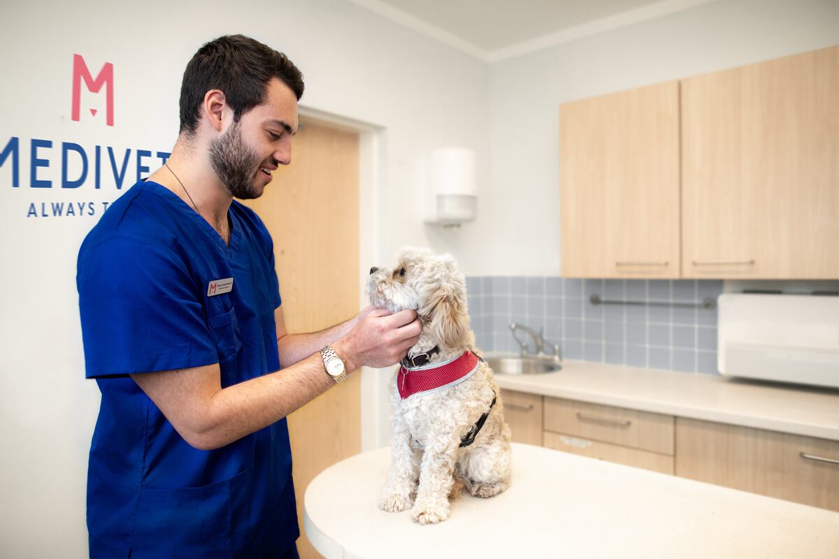 Veterinario examinando a un perro mayor en la clínica. Foto Medivet.