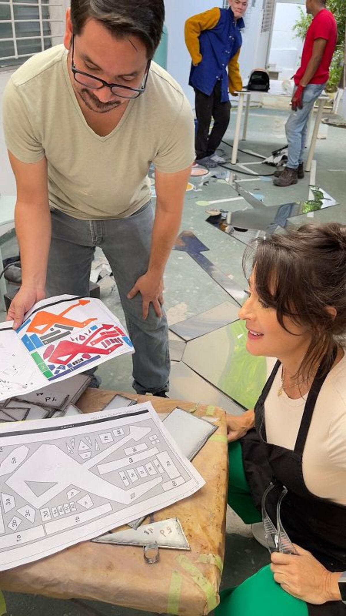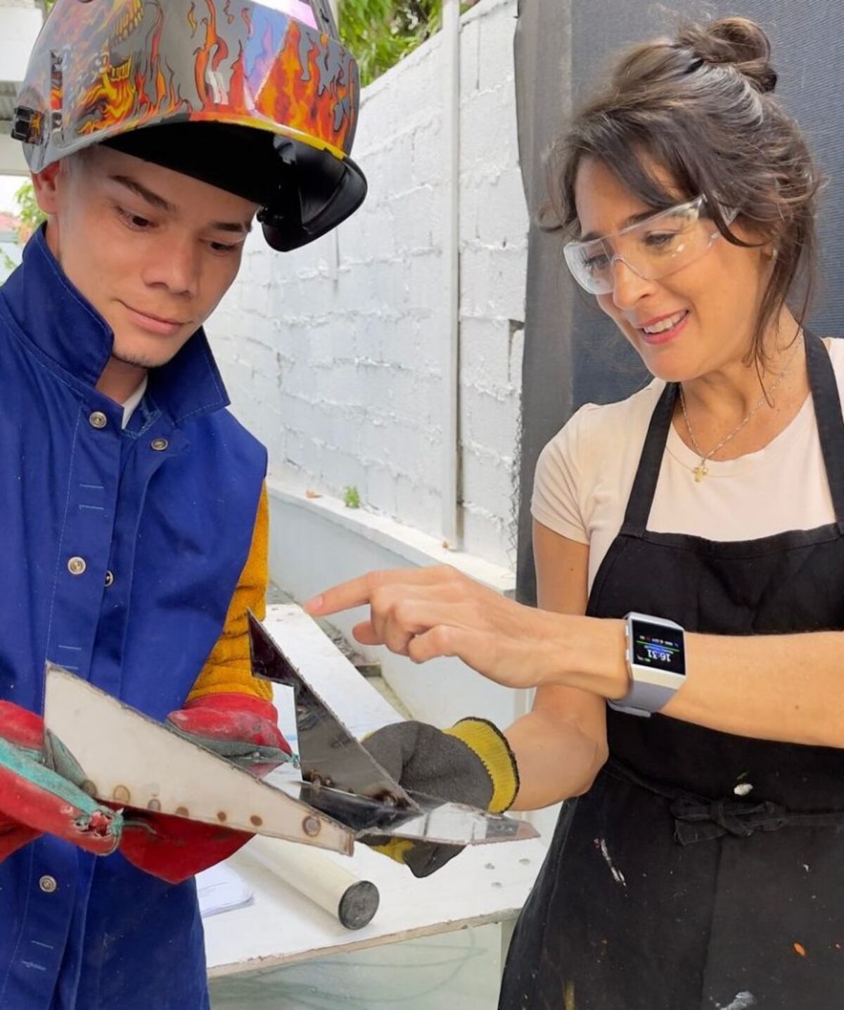 “La escultura se eleva a lo alto a través de líneas dinámicas que convergen en una composición en X abstrayendo así el concepto de la pieza en su diseño. Lleva en su base la pala y en su cabeza la pica, elementos indispensables en la vida de Javier. El azul cerúleo representa el cielo que los une; el dorado, los 50 años de aniversario; el plateado, la fortaleza que los caracteriza; y el acero espejo, el reflejo de ver hacia tu interior y reflejarte bajo la mirada de san Francisco Javier”, describió la artista.