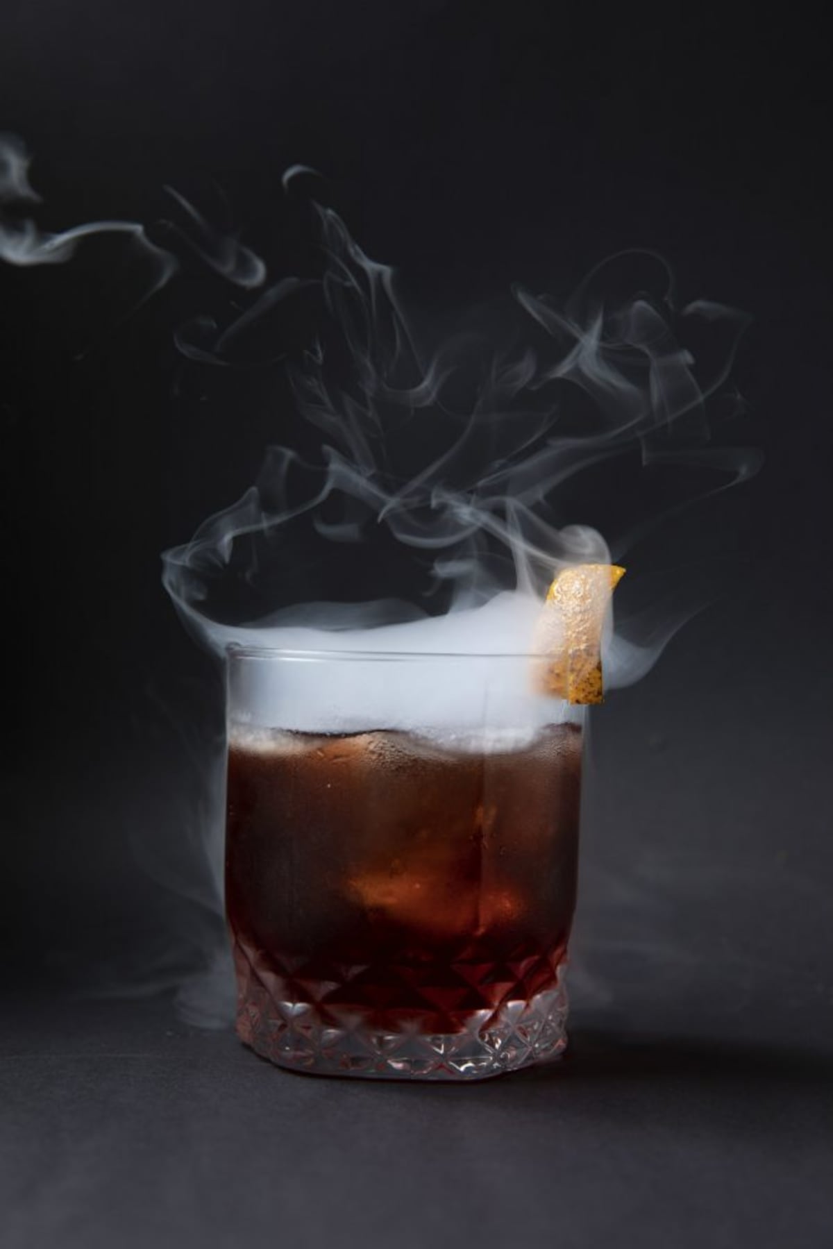 1 onza de ron oscuro añejo (7-10 años) infusionado con tabaco por siete días 1 onza de ron oscuro añejo (7-10 años) infusionado con tabaco por siete días 1 onza de Campari 1 onza de Carpano Antica o cualquier vermouth dulce Cáscara de naranja quemada como garnitura