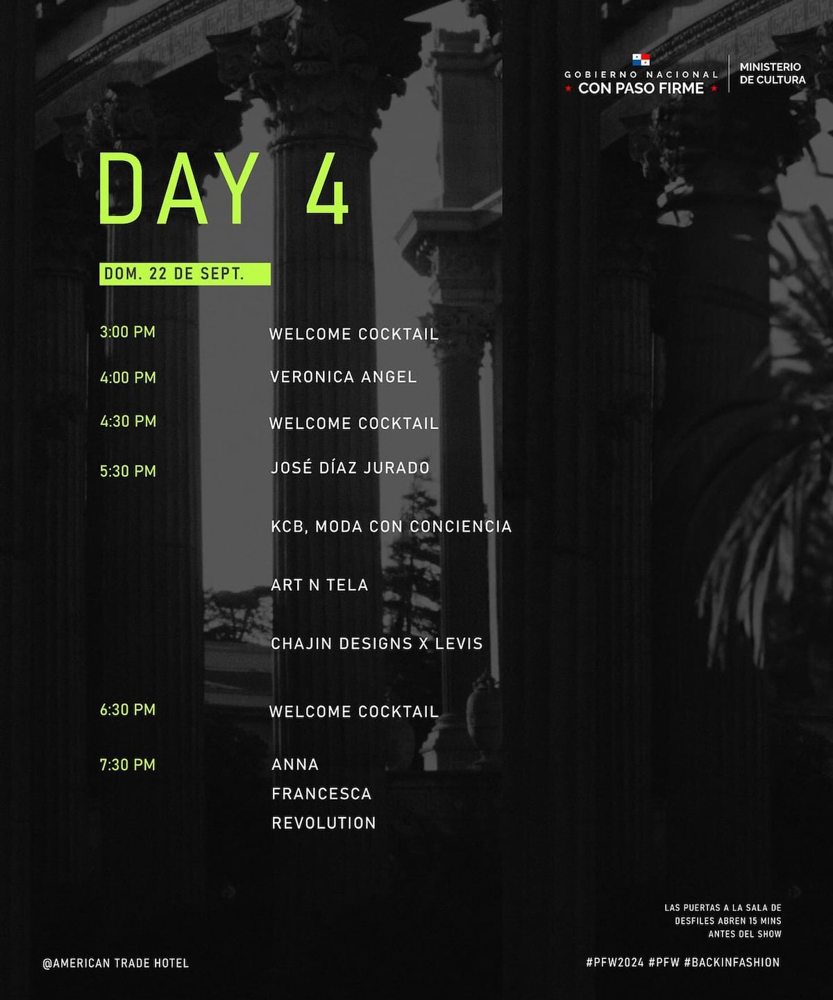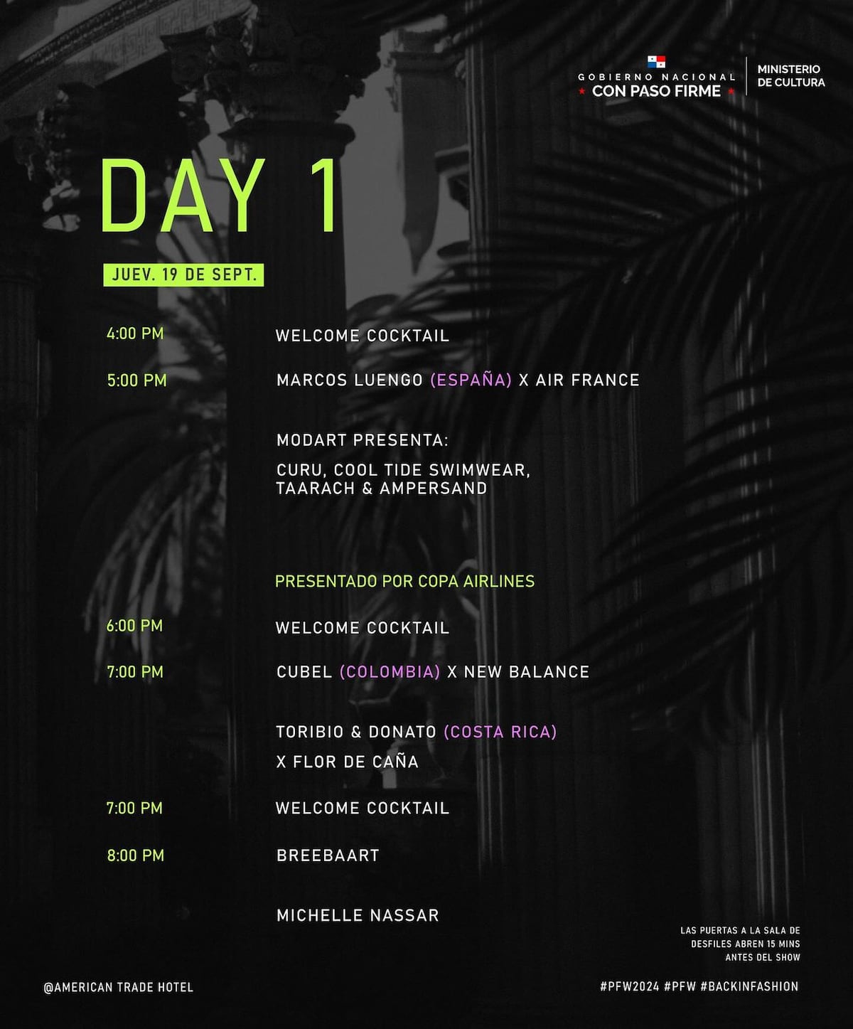 Las puertas a la sala de desfiles abrirán 15 minutos antes del show. Esta es la agenda de pasarelas por día: