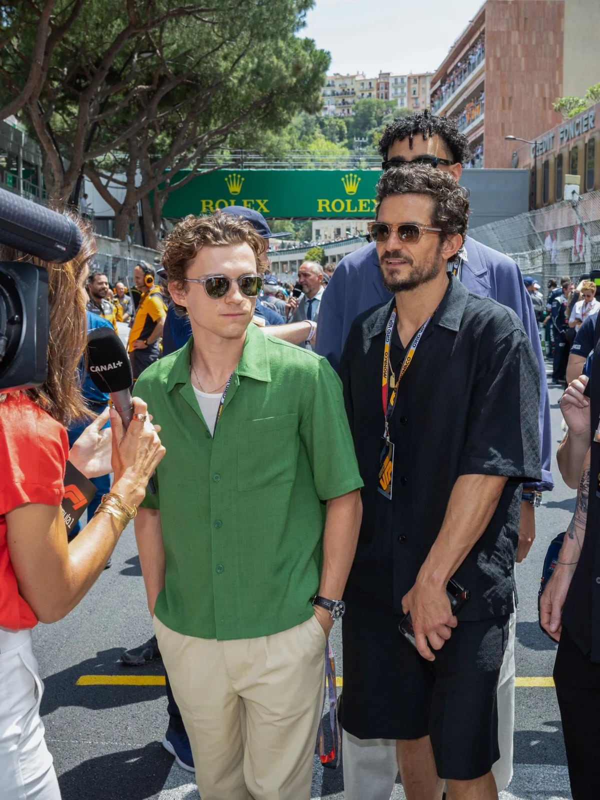 Tom Holland y Orlando Bloom con camisas cuadradas y amplias durante una carrera de F1 en Mónaco.