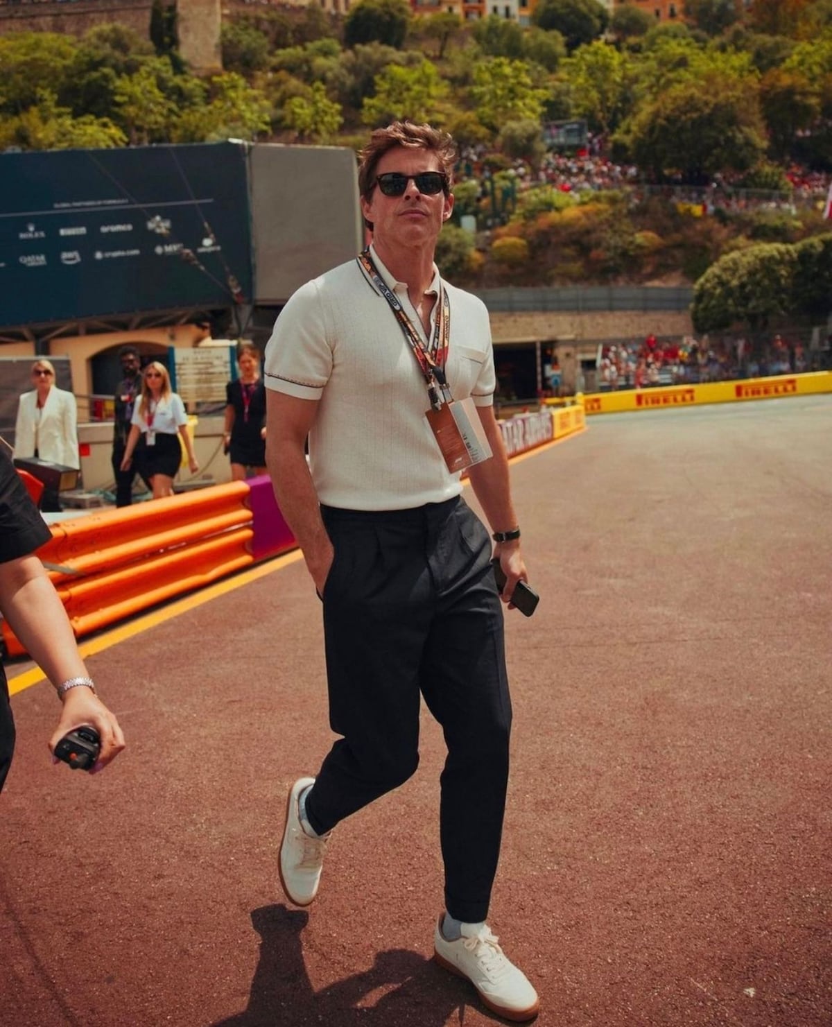 El actor James Marsden y su suéter polo para acudir a una carrera de la F1 en Mónaco.