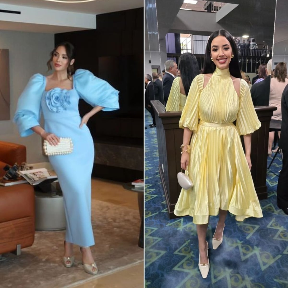 Dayana, quien además es empresaria, utilizó un vestido plisado amarillo con falda suelta. Por su parte, Sheldry, quien es conferencista, autora y columnista en revista ELLAS, lució un traje azul claro estilo coctel al cual tuvo que añadirle mangas para cumplir con el protocolo de vestimenta, según detalló en su cuenta de Instagram.