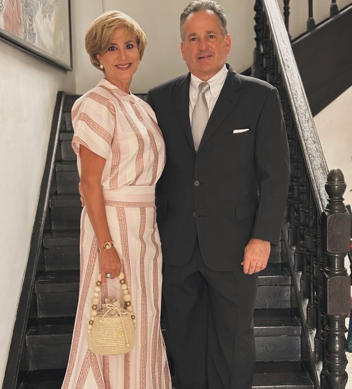 El nuevo ministro de Ambiente, Juan Carlos Navarro posó junto a su esposa Cuqui Campagni. Cuqui lució un vestido en tonos sobrios de líneas gruesas verticales, el cual acompañó con una cartera de la marca Curu Panamá.