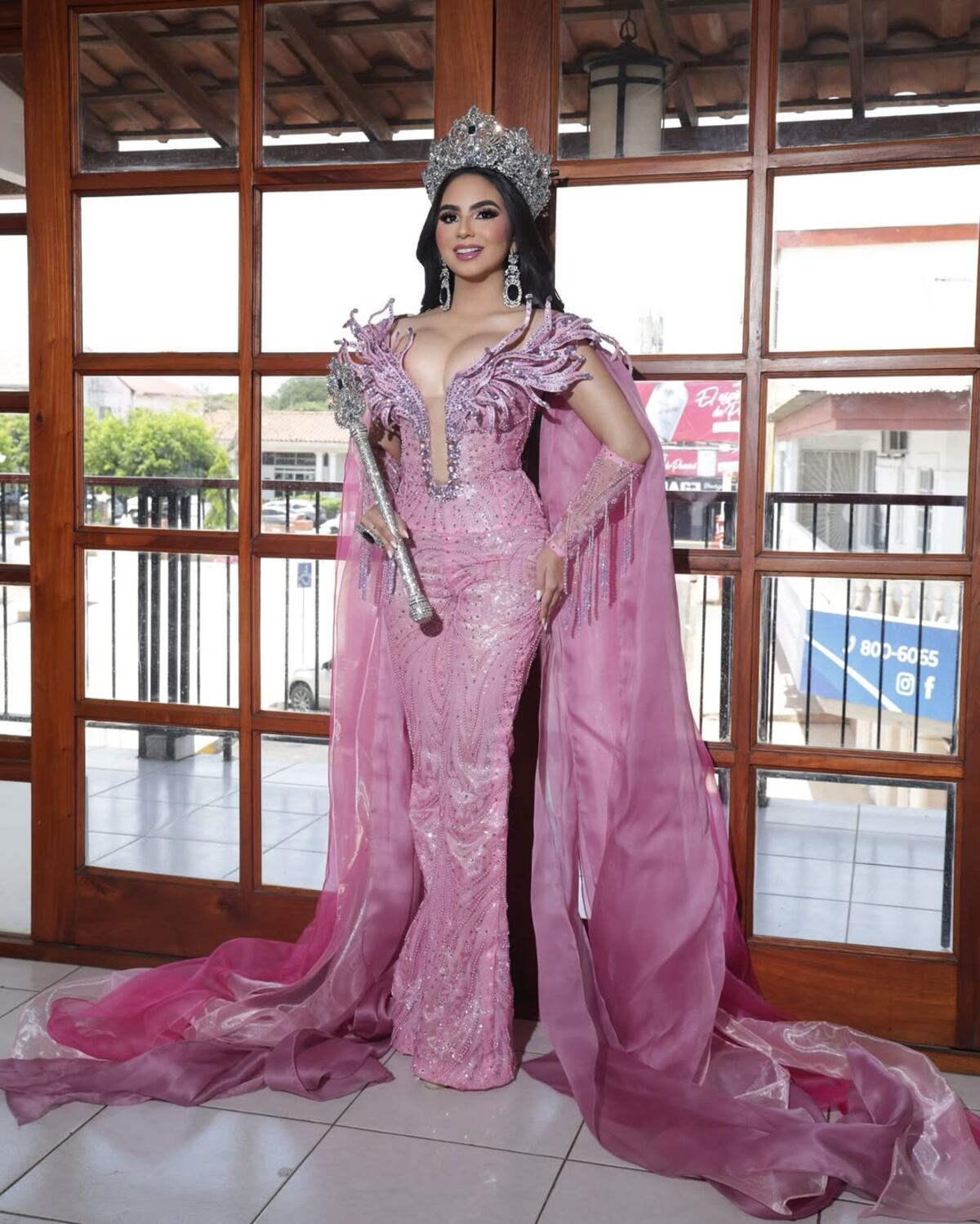 Sofía Gabriela lució un enterizo rosado con escote pronunciado y una capa a juego, creación del diseñador Algis González. Completó su atuendo con la corona y joyas a juego del reconocido orfebre Alejandro Arraiz.