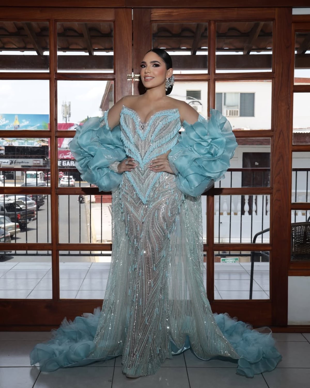 Por su parte, la futura reina 2026, Astrid Carolina, también apostó por un enterizo, esta vez en un delicado tono turquesa pastel. El diseño, acompañado de mangas abultadas y una capa a juego, estuvo a cargo del diseñador santeño José Luis González.