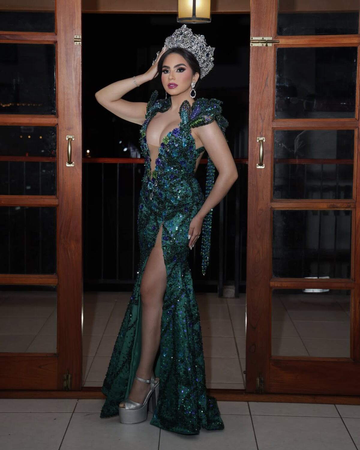 Para la celebración nocturna, la reina Sofía utilizó un vestido en tonos verde esmeralda con pedrería, el cual, según la tuna, “evoca los colores de un pavo real”. El diseño, también de Algis González, fue complementado con unos tacones de plataforma plateados.