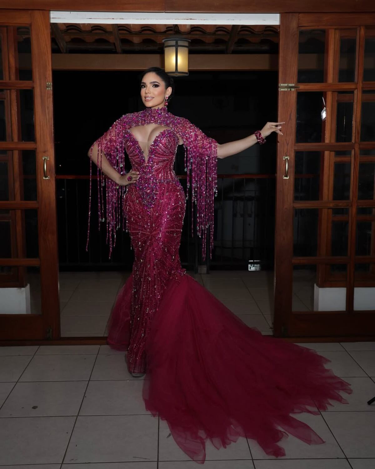 Finalmente, Astrid lució un vestido magenta de corte sirena, adornado con pedrería y una falda con tul, diseñado por el tableño Luis “Coco” Carrasco.