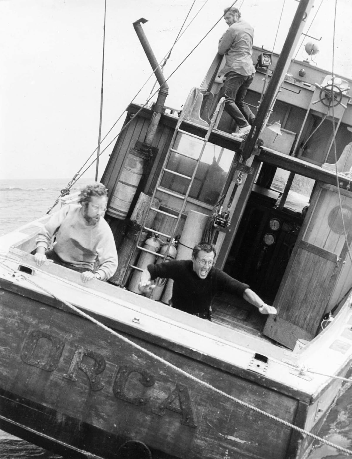 Imagen del rodaje de "Tiburón". Abajo a la izquierda Richard Dreyfuss, a su lado Roy Scheider. Arriba. Robert Shaw. Foto. © Edith Blake (del interior de la novela Tiburón, de Peter Benchley, publicada por Editorial Planeta).