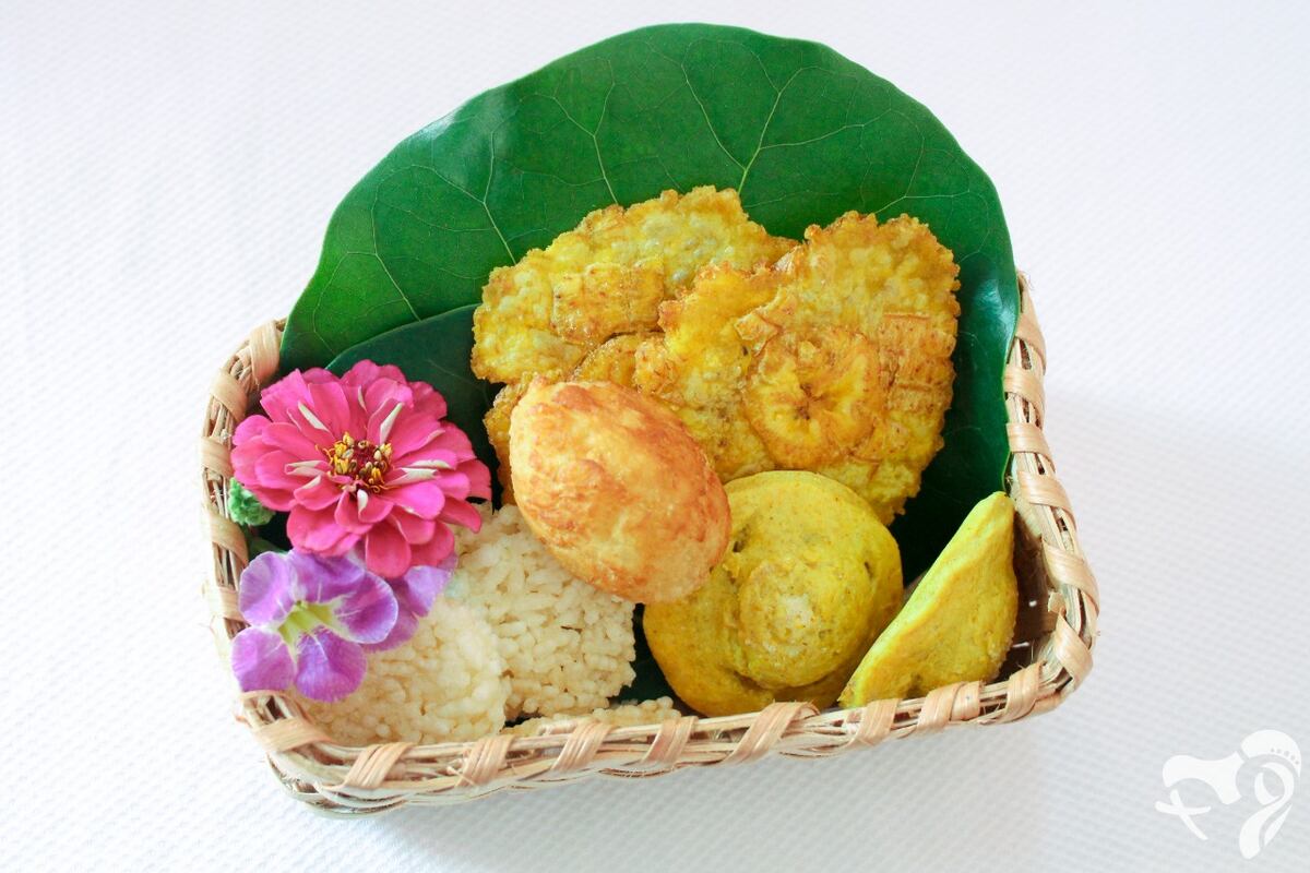 Galletas de concolón, empanadas patti y mini carimañolas en una canasta de bienvenida a los comensales.