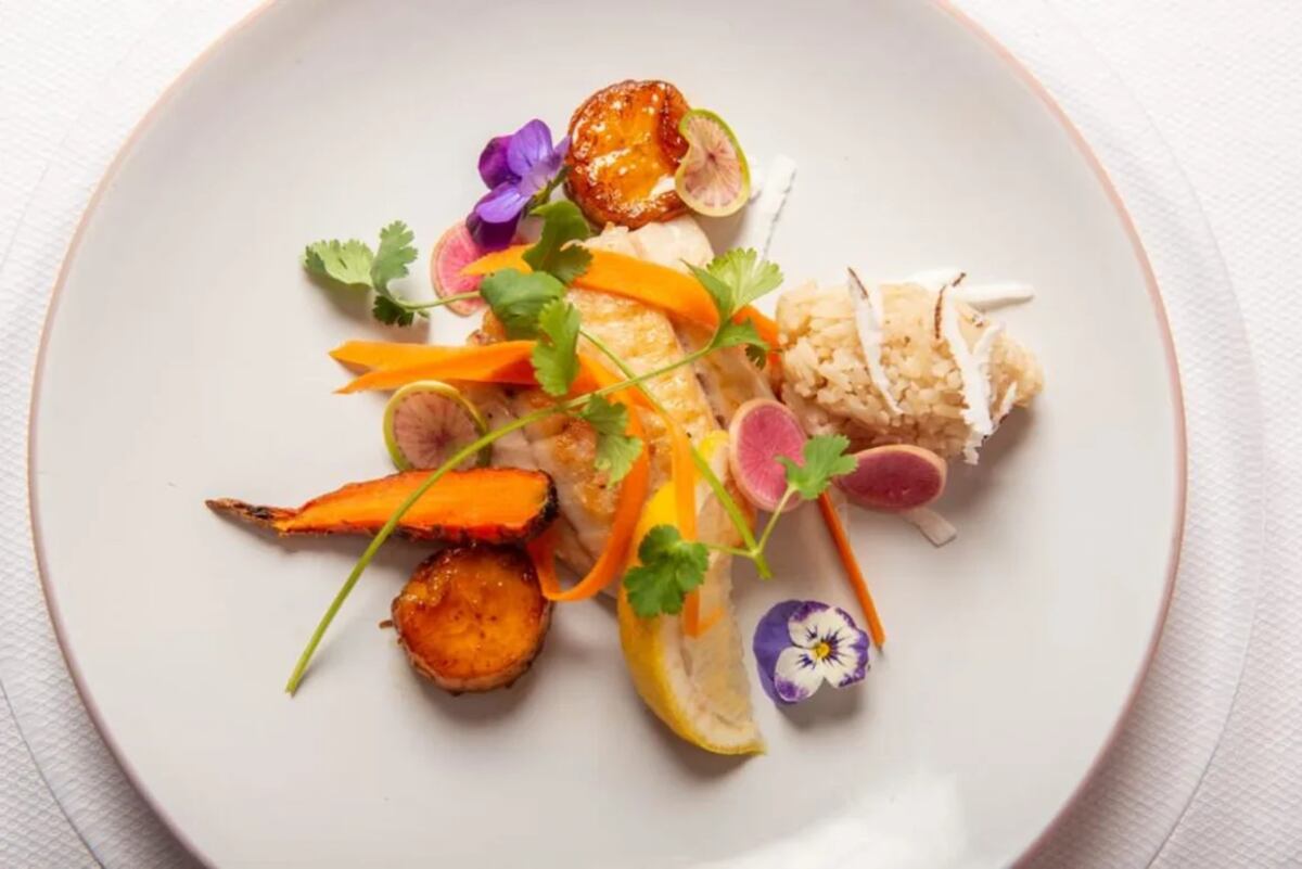El menú para el almuerzo del papa incluía de entrada ensalada de feria, con papa rojita, servida dentro de un aguacate, sobre gazpacho de remolacha. De plato fuerte, corvina fresca del mercado, pescada esa misma mañana por una mujer pescadora de Panamá; arroz con coco y plátanos maduros con miel y canela. El postre fue un bizcocho mojado en melcocha de café, de la variedad Geisha, con crema helada, salsa de café, cubierto en merengue tostado y algodón de azúcar.