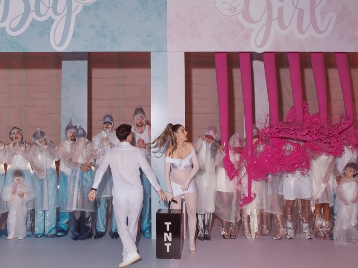 Se activó la pintura rosada, señalando que esperan una niña. Mientras Guaynaa corría celebrando, Lele, que llevaba tacones, resbaló sobre la pintura y cayó de rodillas. Cuando su esposo fue a ayudarla, se volvió a resbalar.