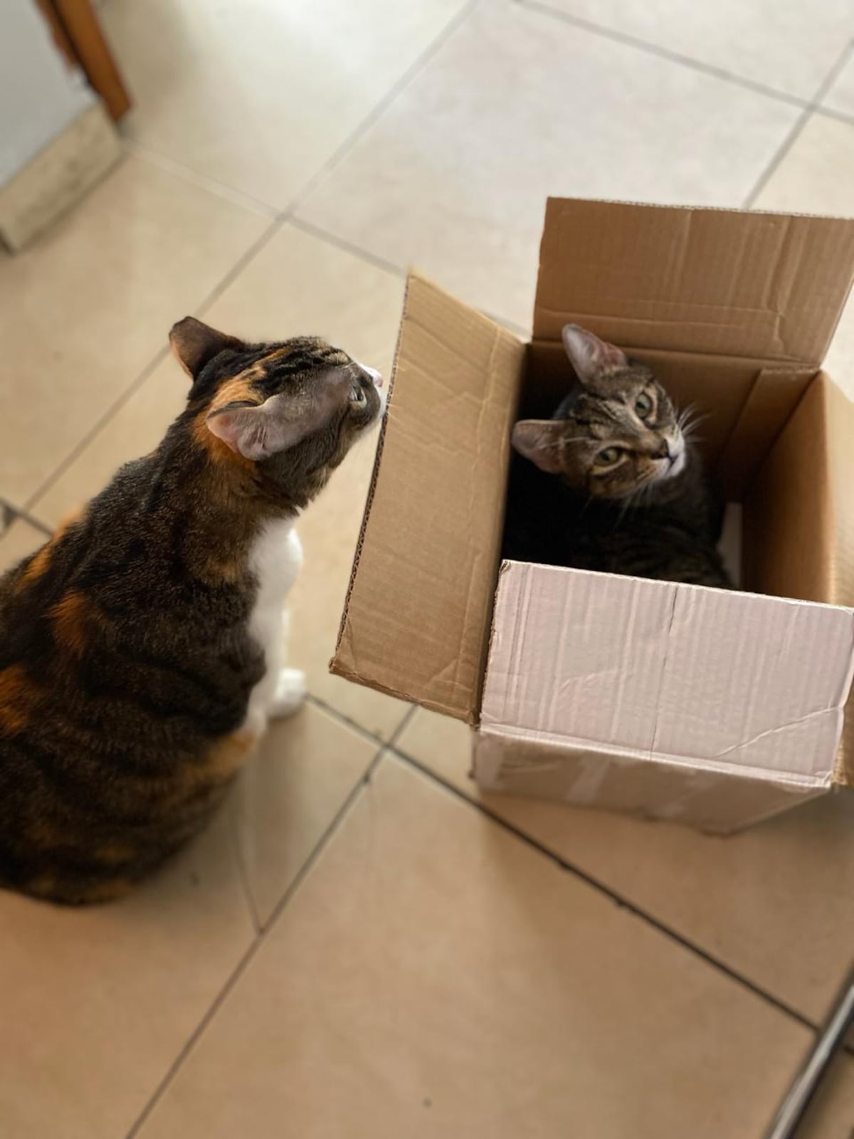 En estos momentos tiene dos: Una de ellas es atigrada, gris. La otra es una gata “cálico”: chocolate, gris, plata.