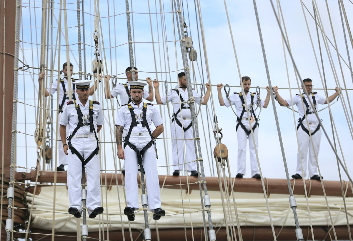 Al despedirnos del capitán, inició una maniobra dentro del barco. Los guardiamarinas, amarrados con arneses, comenzaron a subir por las cuerdas de las velas, hasta quedar distribuidos a distintas alturas del mástil. Me pregunté si no les dolerían los pies al estar de pie sobre las cuerdas. Con el sol picándonos el rostro, intenté ver en dónde se ubicaba la princesa, me pareció verla a lo lejos, pero estaba en lo alto y no pude confirmar si era ella.