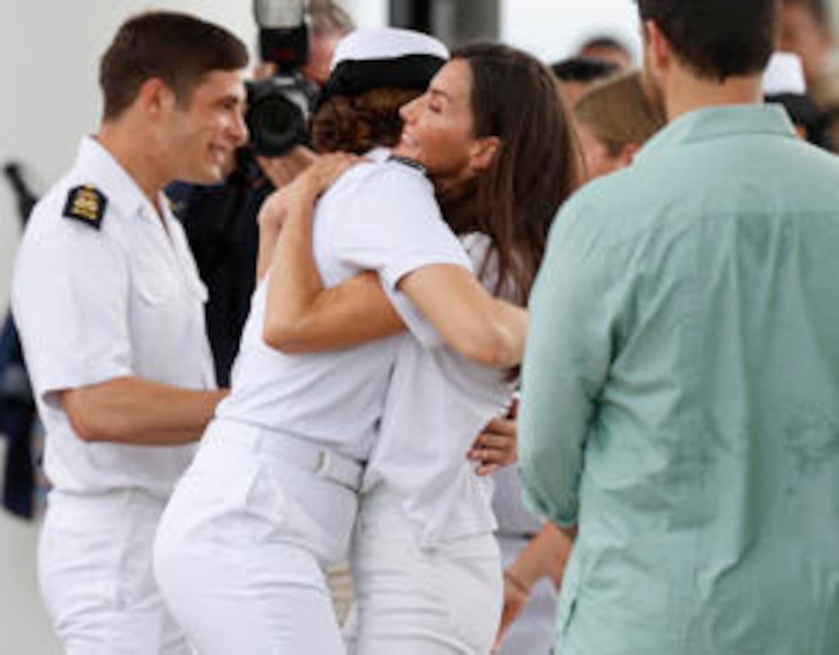 La rampa del buque descendió y, por ella, un grupo de jóvenes corrió hacia el muelle. Entre ellos, la princesa Leonor de Borbón, quien, con una sonrisa en el rostro, abrazó con fuerza a su madre, que la recibía con los brazos abiertos.