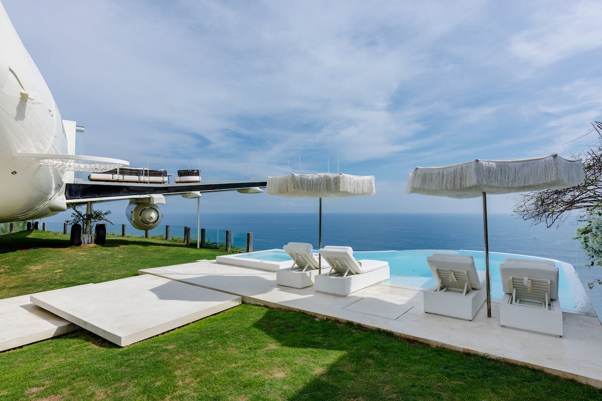 ”El baño en la cabina del piloto con vistas diurnas al océano Índico y vistas nocturnas al cielo estrellado de Bali; la terraza en el ala del avión que proporciona una sensación de vuelo real en los cielos y la piscina en voladizo con una pared transparente que se extiende más allá del borde del acantilado” son escenarios ideales para generar “recuerdos visuales inolvidables”, señalan.