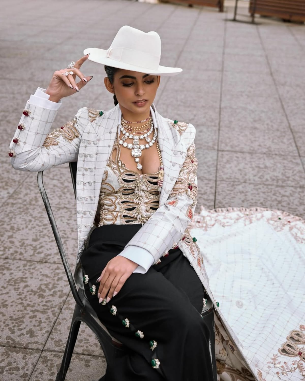 Su atuendo rendía homenaje a la artesanía y daban plataforma a los textiles indios durante la alfombra roja más vista del mundo. se trataba de un look marfil y negro con una tela a cuadros Benarasi, elaborada a mano por la Fundación Swadesh, recubierta de piedras semipreciosas y bordado zardozi a mano en el taller de Anamika Khanna, cuya confección requirió un total de 15 mil horas, según contó al medio The Nod la diseñadora Anamika Khanna.