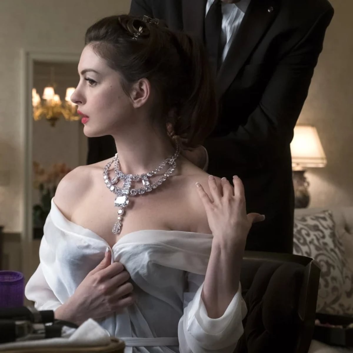 Anne Hathaway durante la película Ocean's 8, luciendo una versión del collar.