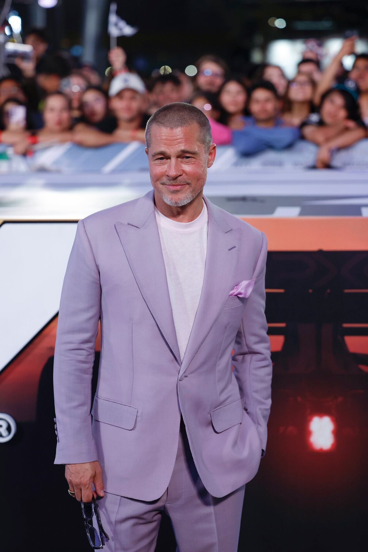 Para la ocasión, Pitt lució un conjunto en tono lila compuesto por un blazer y pantalón a juego, acompañado por una camiseta blanca básica. Completó el look con gafas de sol oscuras y un corte de cabello estilo buzz cut, que remite a su estética de inicios de 2000.