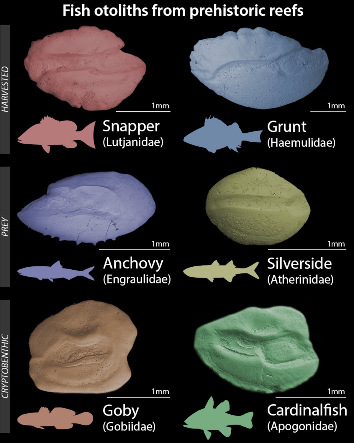 Otolitos —estructuras de carbonato de calcio en el oído interno de los peces— de especies pescadas por humanos, peces presa (consumidos por depredadores), y peces refugiados en los arrecifes de coral (también conocidos como peces cripto-bentónicos) encontrados en arrecifes caribeños fósiles de hace 7000 años en Panamá y República Dominicana. Foto: Cortesía